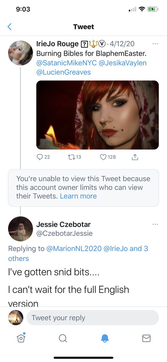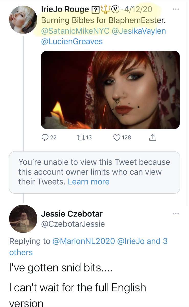“The examination of Jessie Czebotar’s Tweet history should be an eye opener for many. She sides with, and supports, Satanists on many of their goals to the detriment of her own stated ministry objectives...”