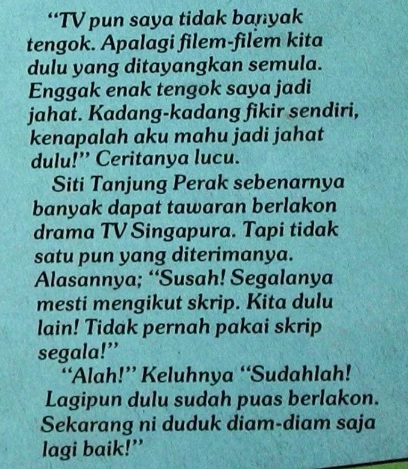 Selepas bersara daripada berlakon, Siti Tanjung Perak tak berapa gemar tengok filem yang dilakonkannya dulu, lebih-lebih lagi kalau dalam filem tu dia pegang watak jahat. “Enggak enak tengok saya jadi jahat. Kadang-kadang fikir sendiri kenapalah aku ahu jadi jahat dulu!”