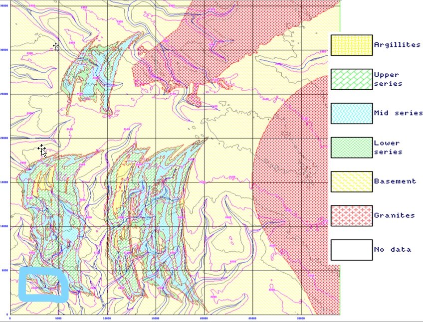 Ohne gebohrt zu haben oder anderes teures Gerät eingesetzt zu haben, wissen wir also schonmal, dass die Grenze zwischen "Sandstone" (Sandstein) und "Shale" (Tonstein) vielversprechend ist.