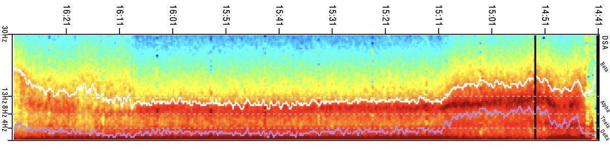 Here’s the DSA for this patient, notice how “red” the alpha band is. Plenty of power here, that’s those great big oscillations!