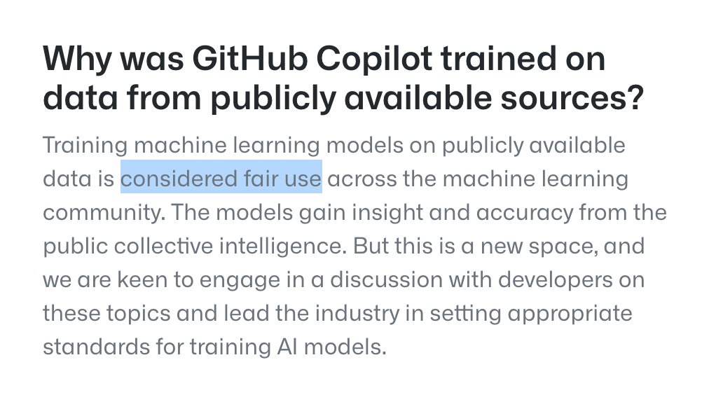 Since they trained on content hosted on GitHub that already falls under their T&C, when they call it "Fair Use" it's a way to circumvent the explicit license — which could weaken their argument legally and makes it very different from other cases.