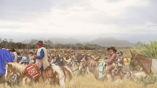 3.En torno a 1790, había cientos de jinetes hispanos custodiando las rutas entre México y California, así como el camino que unía San Luis (actual Misuri) con Santa Fe. La mitad de ellos eran de origen español y la otra mitad mestiza, mulata, o de ascendencia india.