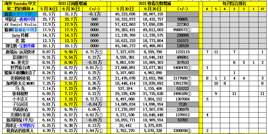 6月,一档自媒体最新排名新鲜出炉。综合排名前10名:朱学恒、文昭、陈破空、大宇、王剑、Leonard、大康、德传媒、狗哥、公子沈。台湾朱学恒第一次跻身第一档,即排名第一。台湾还有李四端、谢金河等(暂时未统计)。大康有话说表现抢眼。