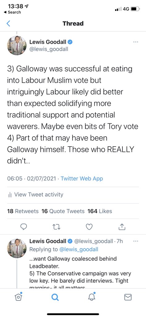 ...want Galloway coalesced behind Leadbeater. 5) The Conservative campaign was very low key. He barely did interviews. Tight margins- it all matters. 6) The Tory national lead has shrunk in the last weeks. Hancock may have...