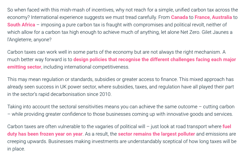 As @EnergySysCat chief exec says "a carbon tax is not the silver bullet" and "imposing a pure carbon tax is fraught with compromises and political revolt…Gilet Jaunes a l’Angleterre, anyone?"