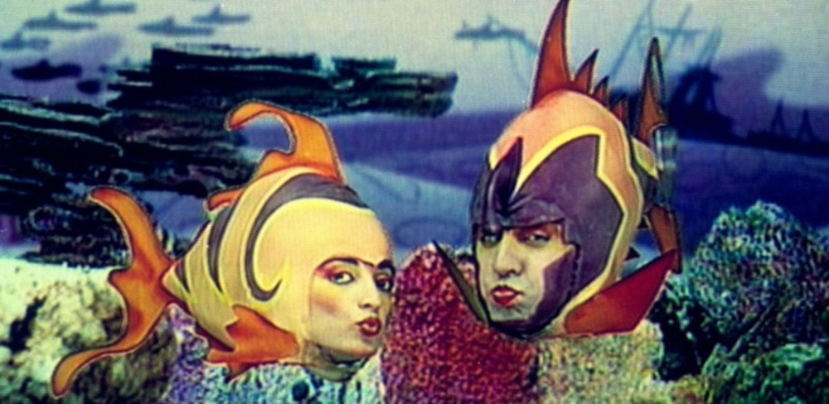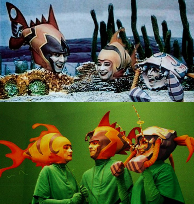 This one is weird! It's from early 80s and it was a weird concept to start with but it really succeed on TV. They're characters from a show called Glub Glub, it stayed on air forever. And it was quite a bold/innovative use of chroma for a low budget periodic 80s kids show.