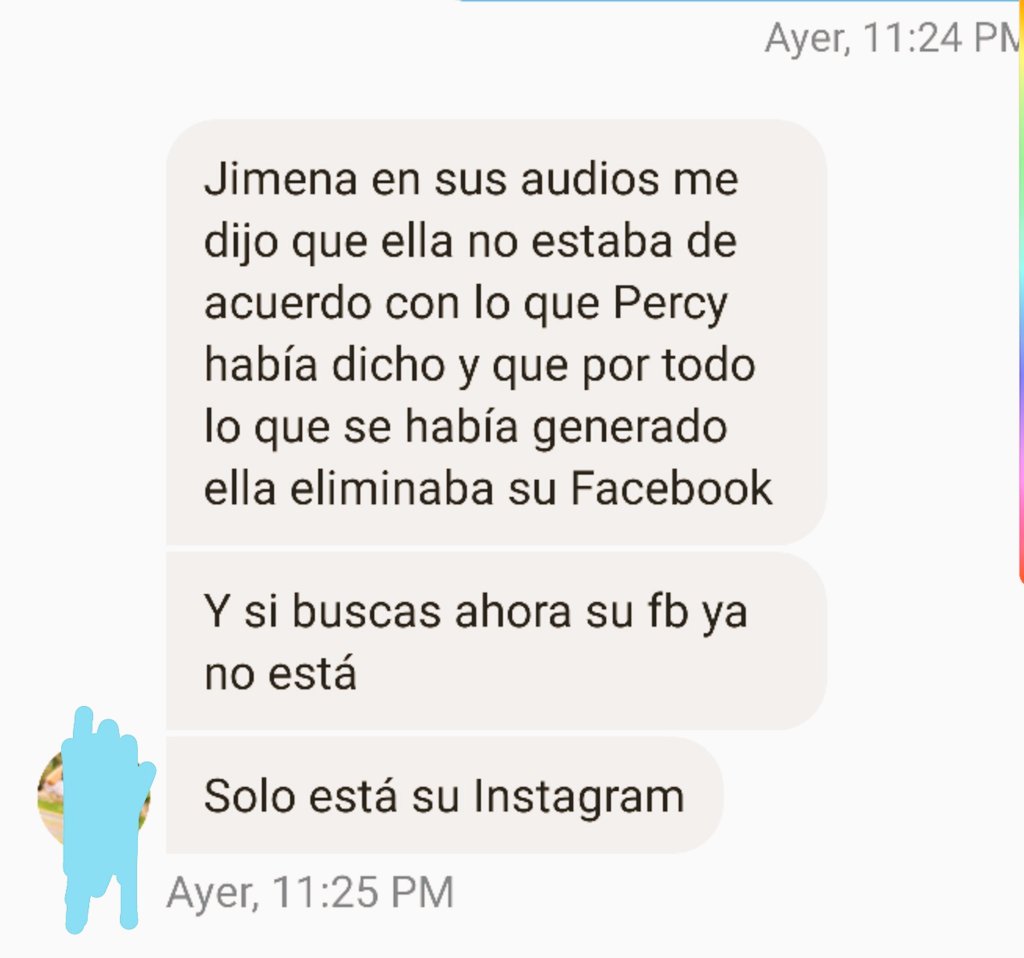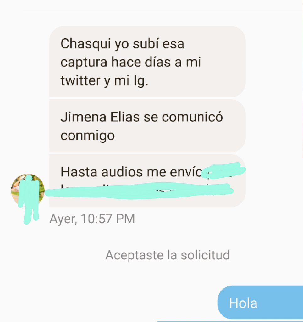 Jimena Elías se comunicó con varias personas que denunciaron el hecho por Instagram y les envío audios y mensajes para q pararan. Trataba de evitar que se formara lo q hoy se ha formado.