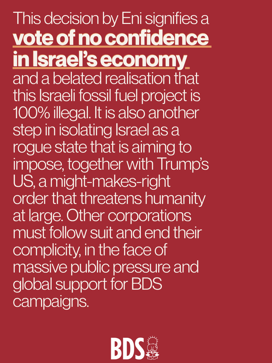 The move follows years of relentless international pressure exposing Eni's complicity in Israel's genocide against 2.3 million Palestinians in Gaza, its illegal occupation and regime of apartheid.