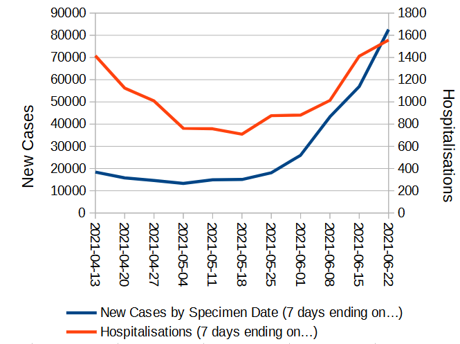Cases may be rising faster than hospitalisations, and hospitalisations may be rising faster than deaths but that doesn't take away from the fact that ALL THREE are currently rising.