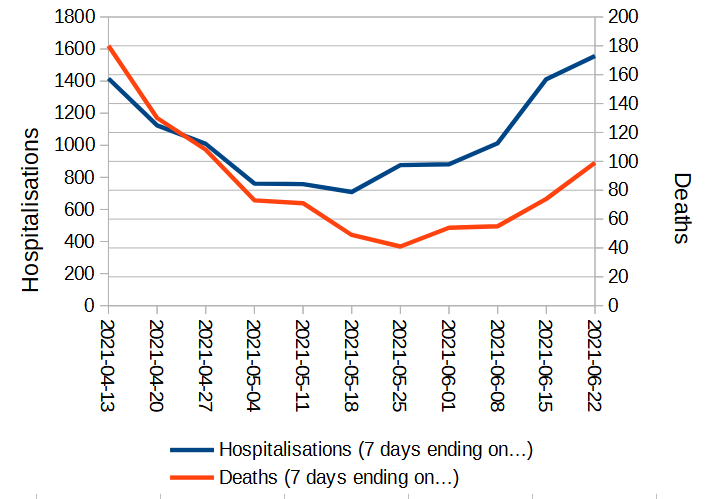 The vaccine has helped. For sure. But people are still being hospitalised in rising numbers. They are also dying in rising numbers.