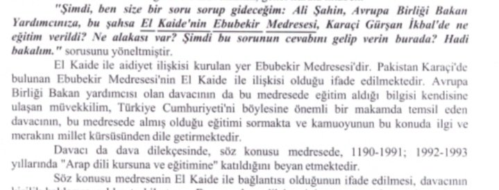 5-Ali Şahin hakkında TBMM kürsüsünde sorulan soru “ PAKİSTAN – KARAÇİ – EBU BEKİR MEDRESESİNDE GÜLŞEN İQBAL adresinde AB BAKAN YARDIMCISI olan kişi ( EL KAİDE MEDRESESİNDE ne eğitimi almıştır.)