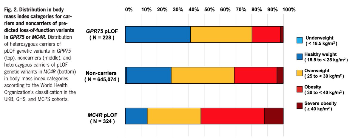 Unlike MC4R where loss of function leads to obesity, with GPR75 loss of function protects against obesity. Look at this beautiful contrast in the distribution of obese and underweight individuals in MC4R lof carriers vs GPR75 lof carriers.