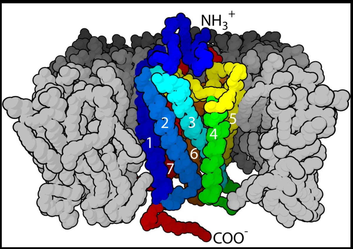 Both belong to the largest family of membrane receptors in humans: GPCRs, which is also "considered the largest family of targets for approved drugs". Here is a pic of rhodopsin (from wikipedia) molpharm.aspetjournals.org/content/93/4/2…