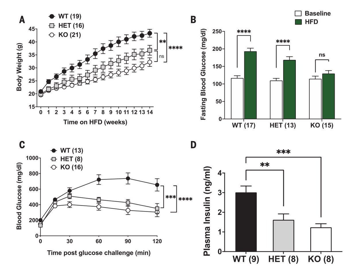 Knocking out GPR75 in mice leads to an impressive resistance to high fat diet induced weight gain. Not just that, the mice is also resistant to metabolic effects of HFD like glucose and insulin impairments.