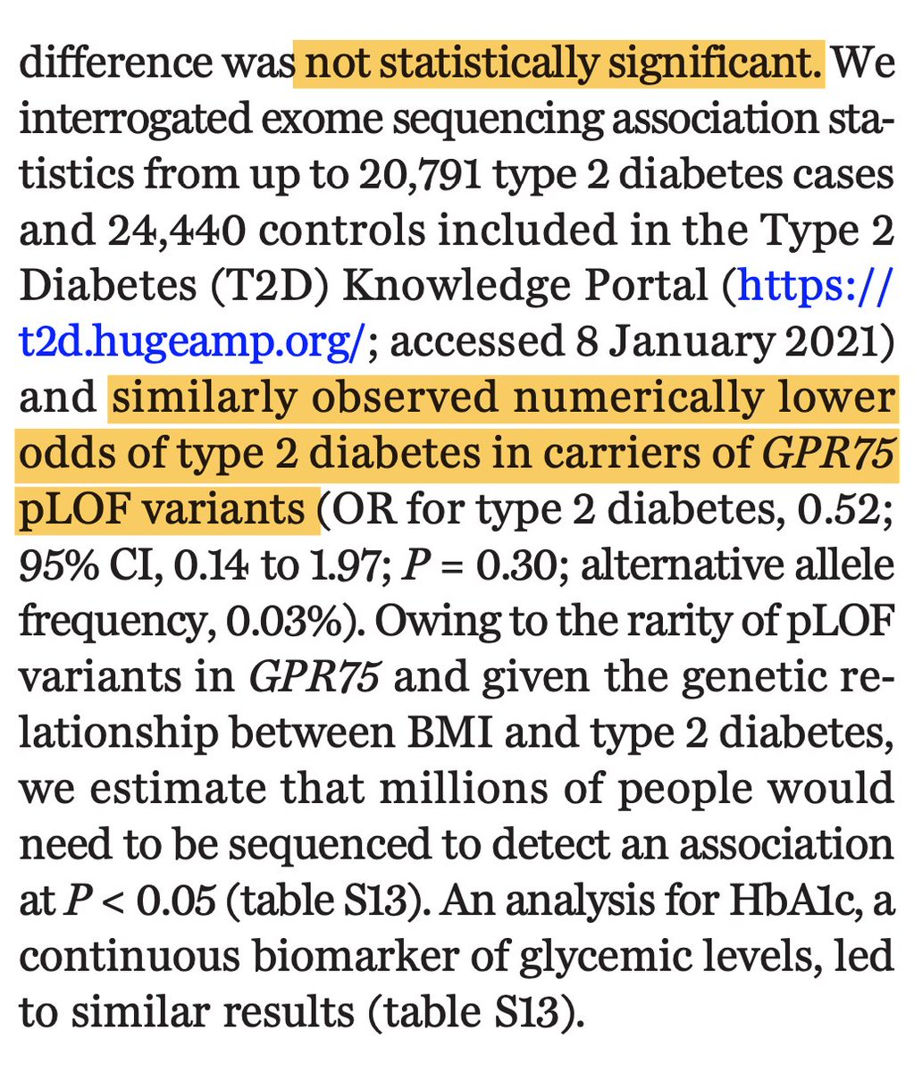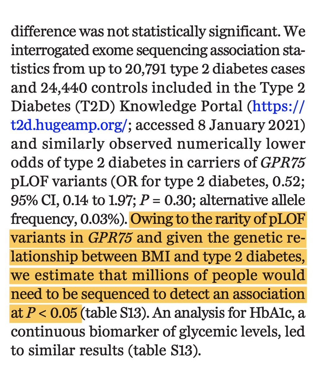 Note here it's likely the BMI is proximal but the metabolic effects are distal to GPR75. Also considering the strong environmental influences on diabetes and lipid traits, detecting a statistically significant associations in humans will require extremely large sample sizes.