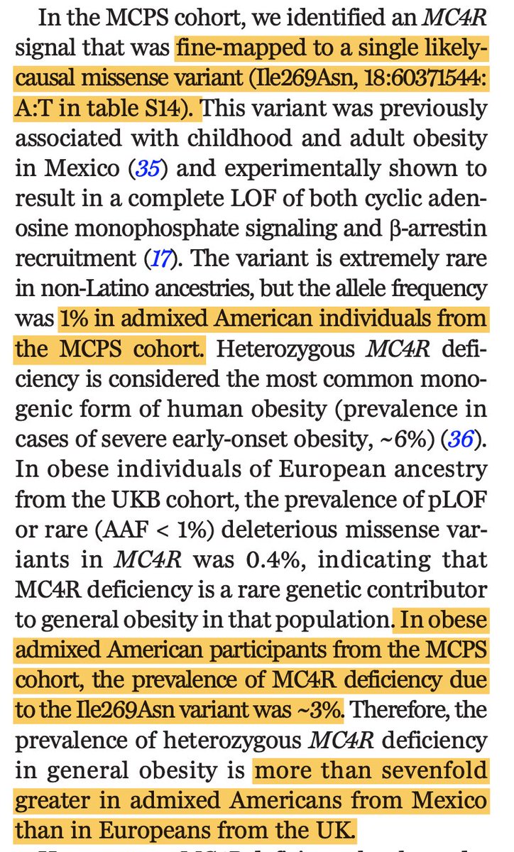 So, obviously these individuals should be enriched for obesity related genetic mutations. The authors identified a lof missense variant in MC4R that is present 1% of the admixed Americans in Mexico, but rare elsewhere in the world.