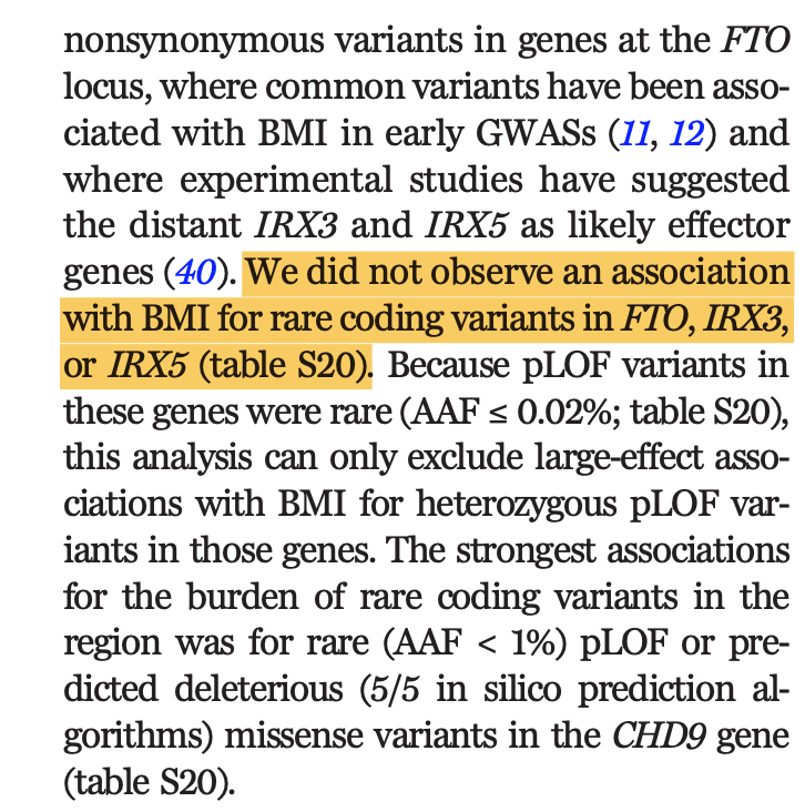 So, my take way here is, though rare variants more often pinpoint causal genes at common variants identified GWAS loci, it's not always the case. FTO locus is a good example.