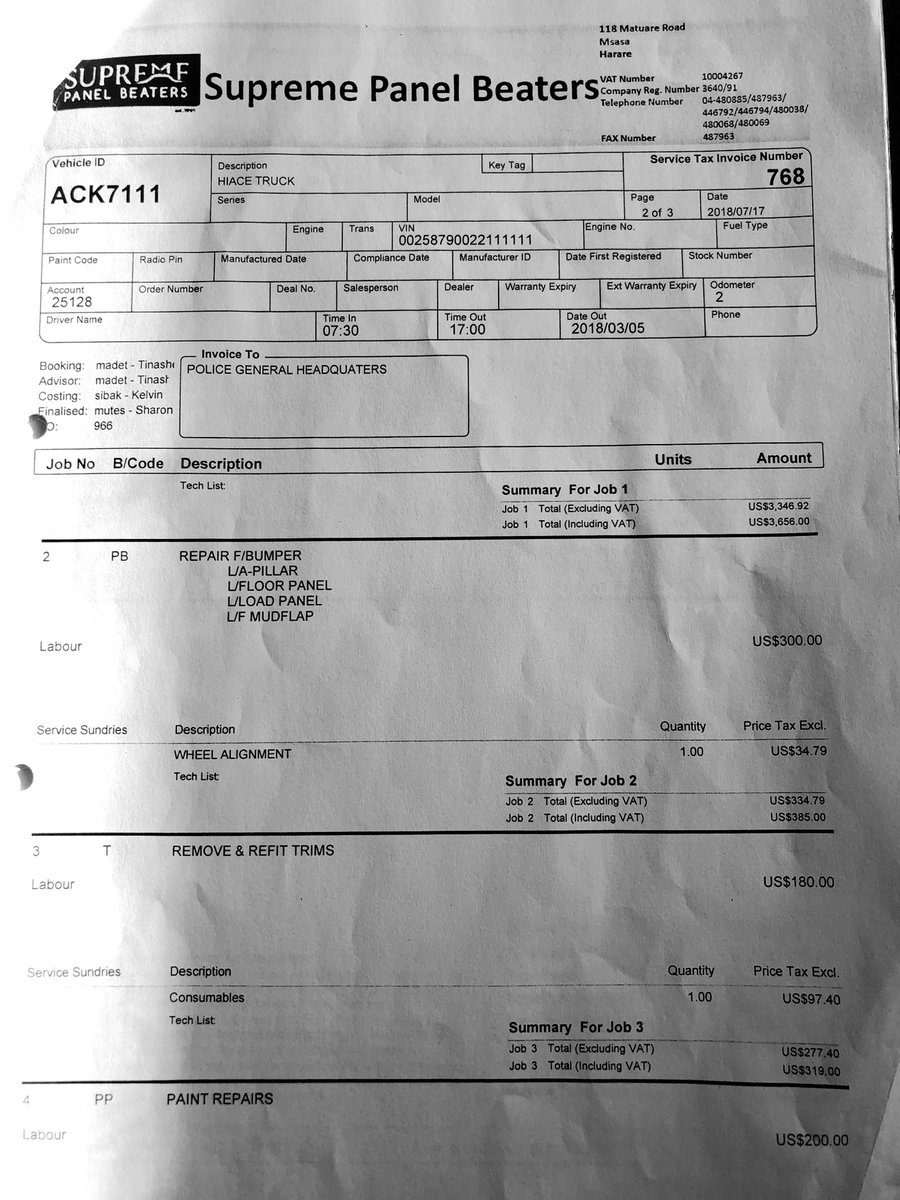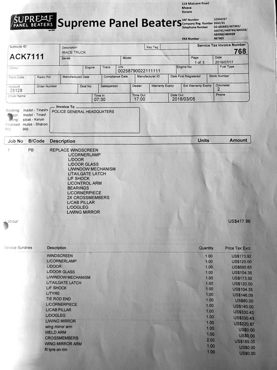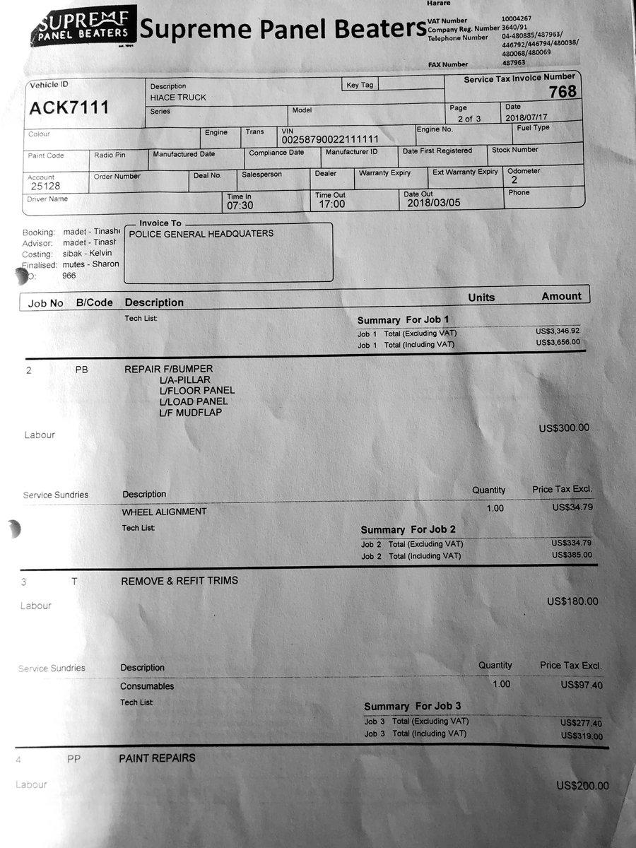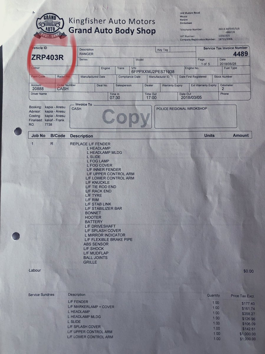 5/ The police vehicle was repaired at the cost of USD13,096.22 at Kingfisher Auto Motors T/A Grand Auto Body Shop whilst the 3rd Party vehicle was repaired at Supreme Panel Beaters to the tune of USD4,990.00 BUT using the reg details of a stationery ZRP Transport Reserve vehicle,