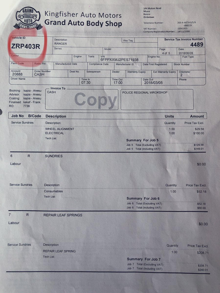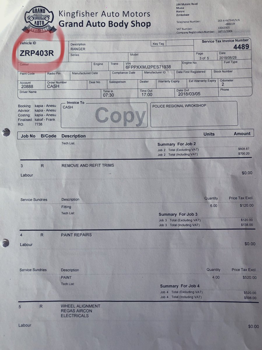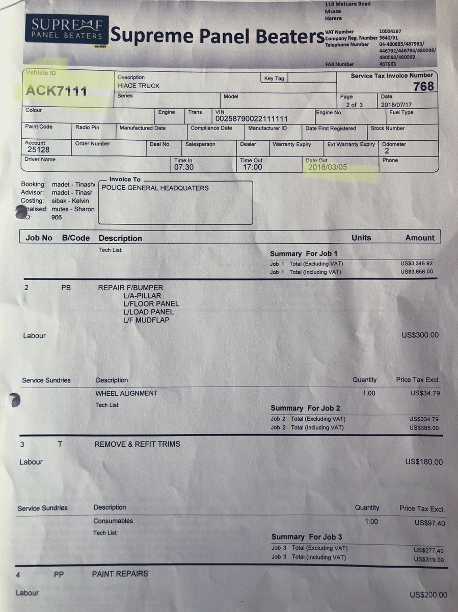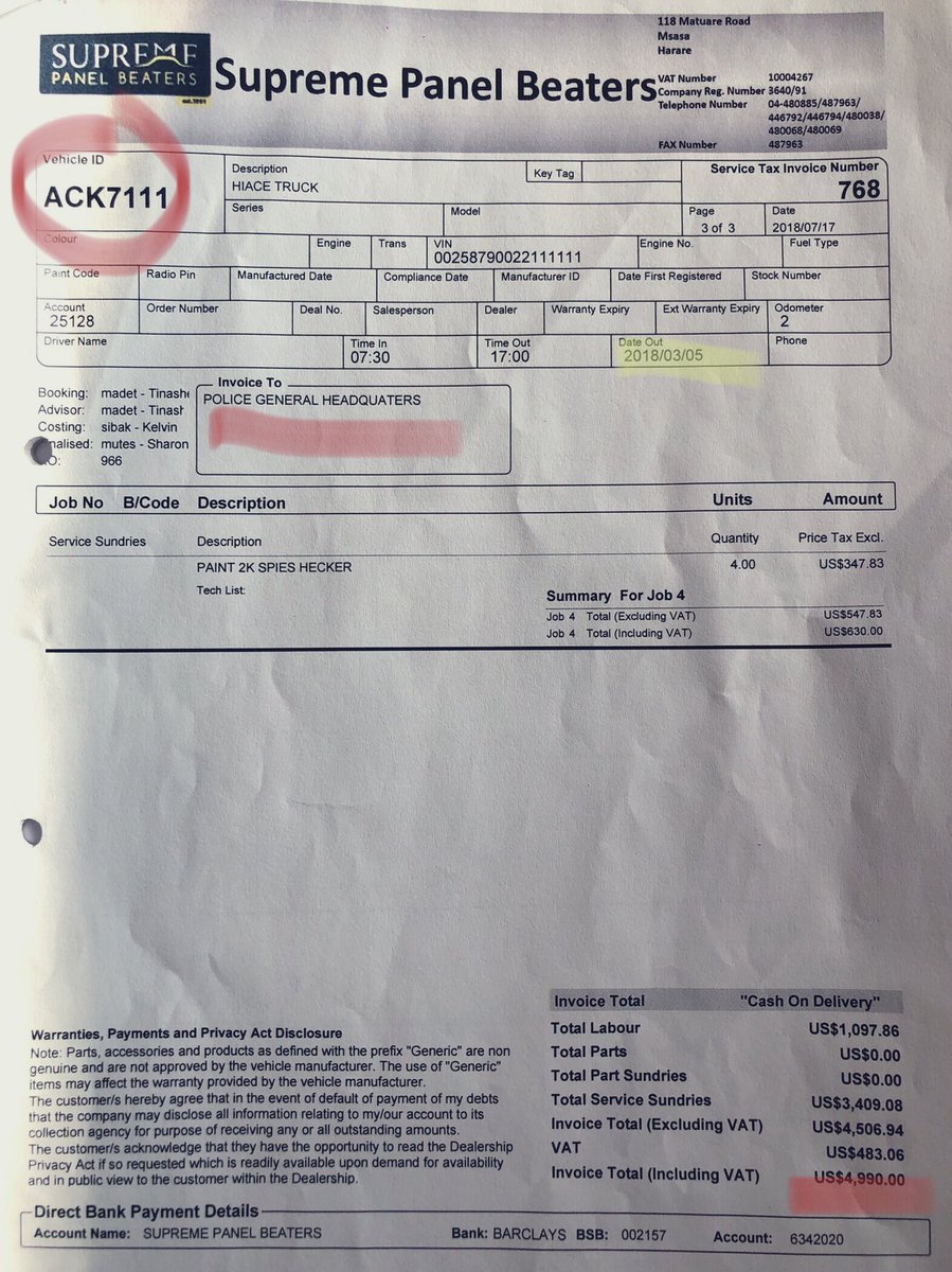 5/ The police vehicle was repaired at the cost of USD13,096.22 at Kingfisher Auto Motors T/A Grand Auto Body Shop whilst the 3rd Party vehicle was repaired at Supreme Panel Beaters to the tune of USD4,990.00 BUT using the reg details of a stationery ZRP Transport Reserve vehicle,