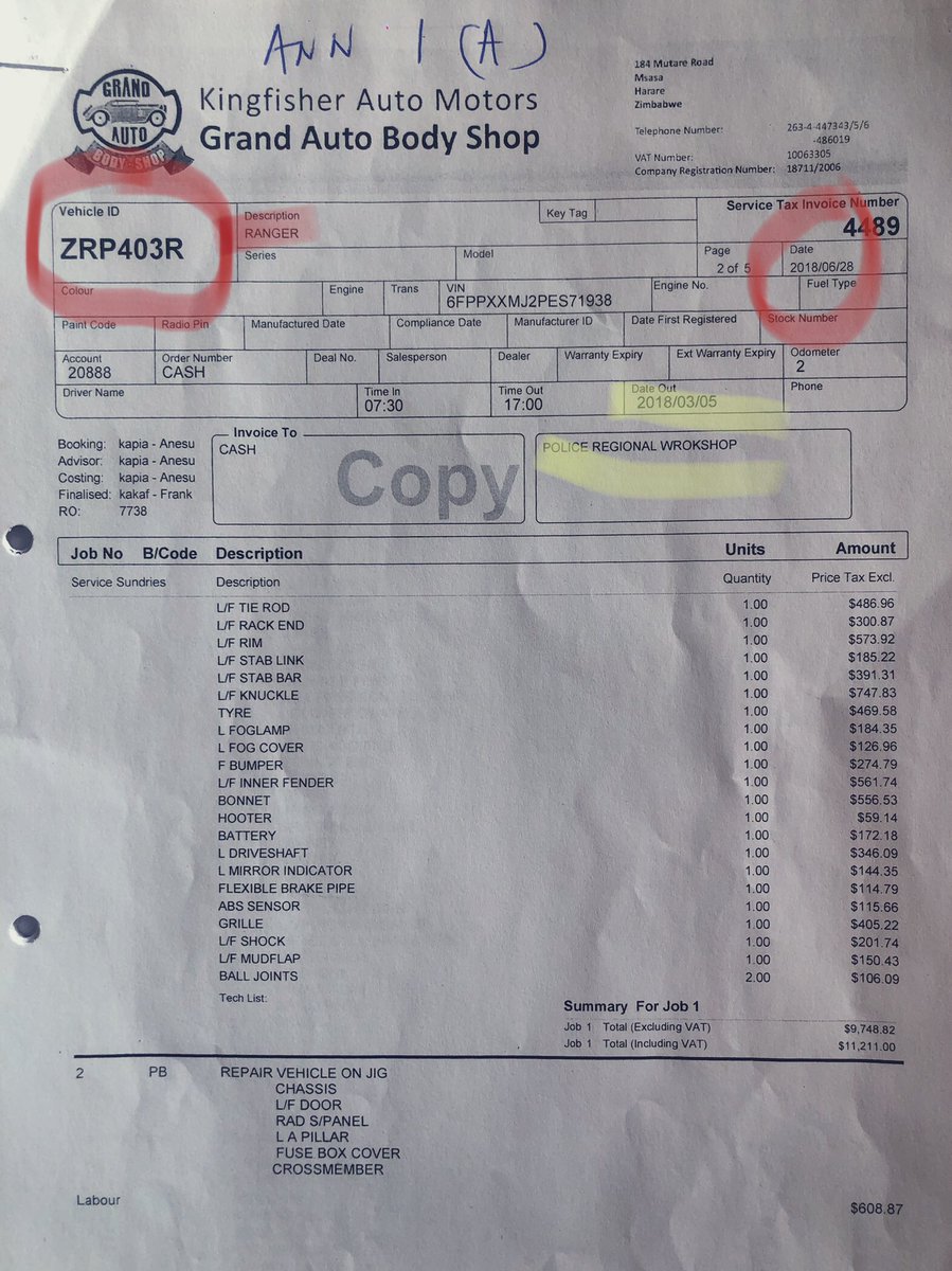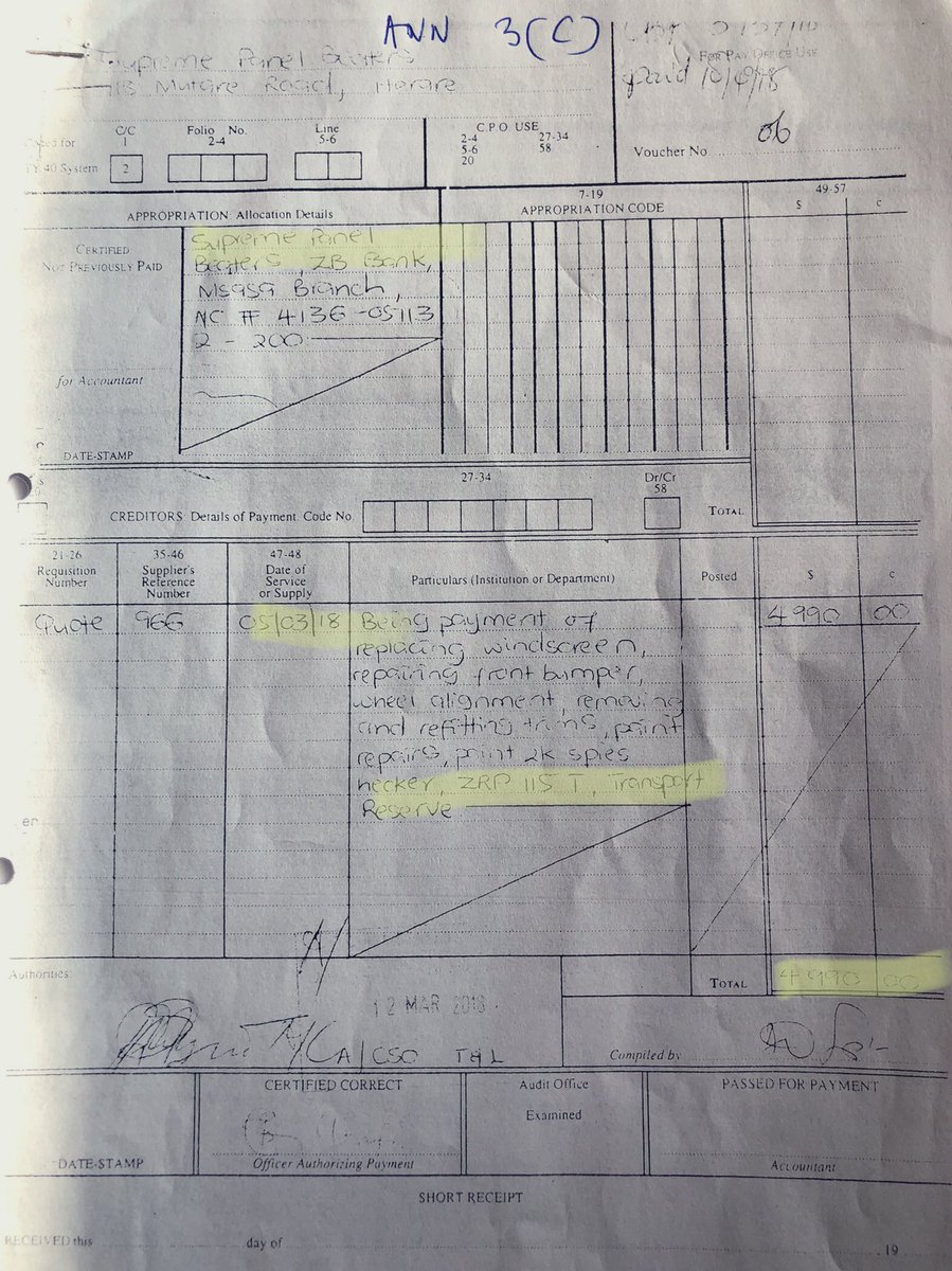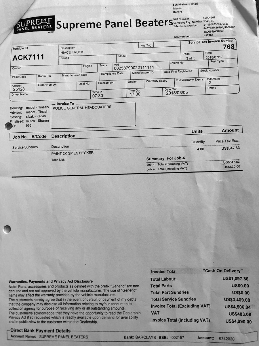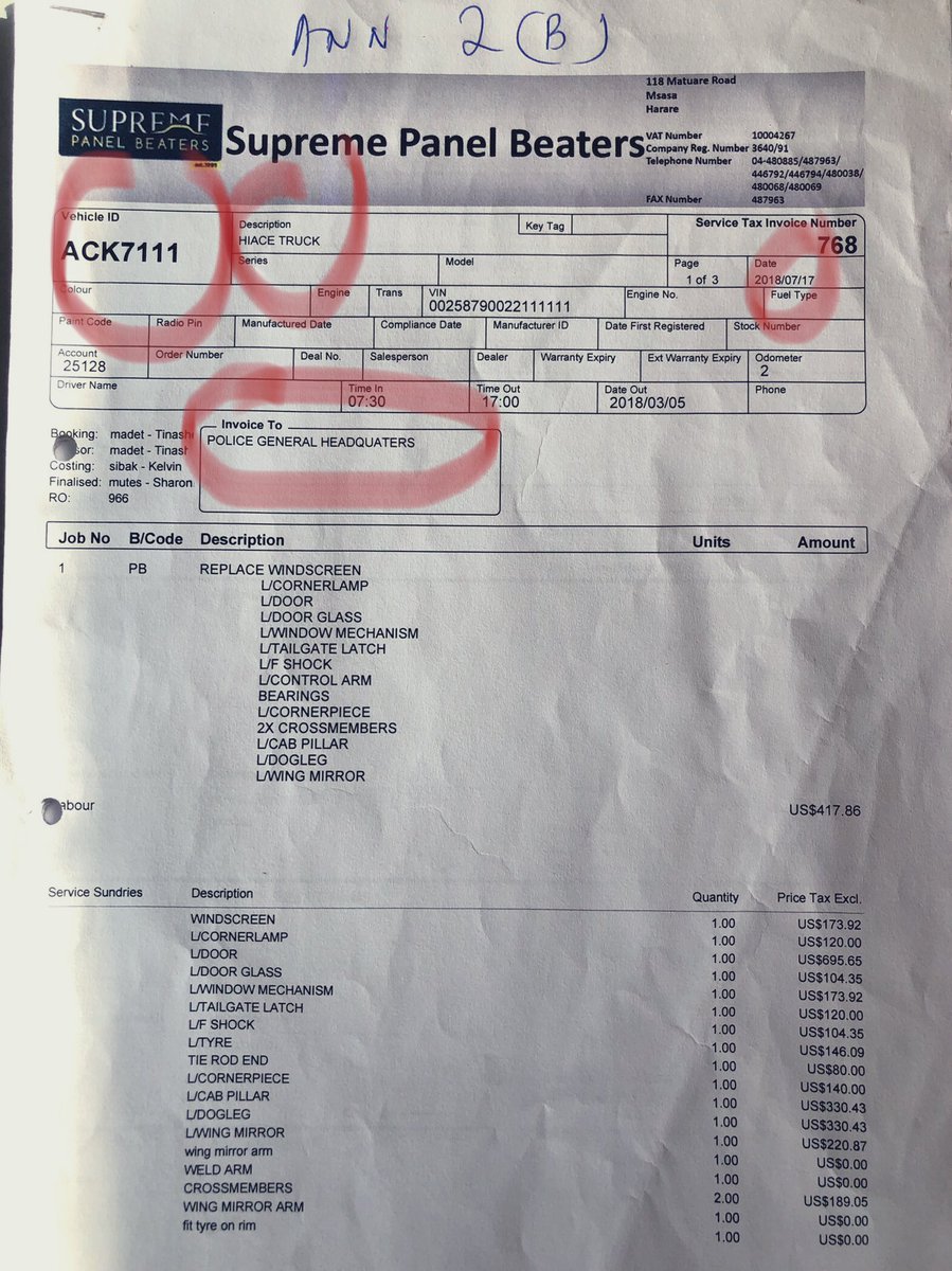 5/ The police vehicle was repaired at the cost of USD13,096.22 at Kingfisher Auto Motors T/A Grand Auto Body Shop whilst the 3rd Party vehicle was repaired at Supreme Panel Beaters to the tune of USD4,990.00 BUT using the reg details of a stationery ZRP Transport Reserve vehicle,