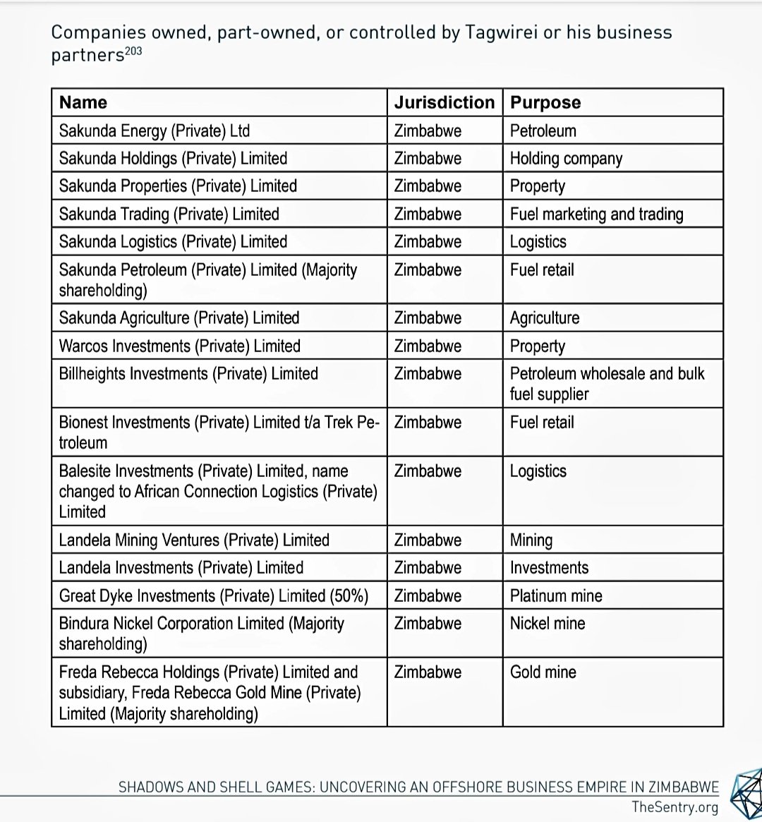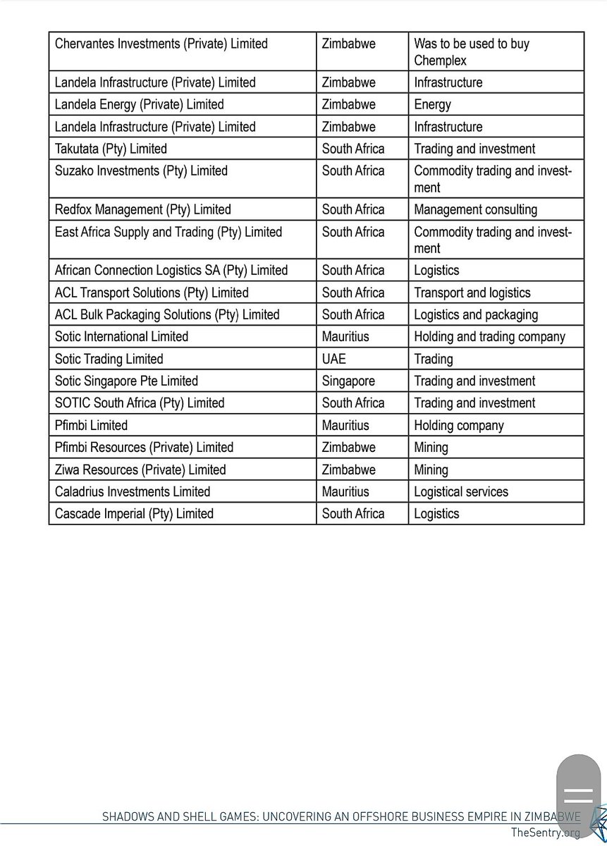 A new report by a United States investigative group The Sentry, titled Shadows and Shell Games: Uncovering an Offshore Business Empire in Zimbabwe,reveals key details of Zimbabwean tycoon Kudakwashe Tagwirei's business empire, structures and practices. thesentry.org/reports/shadow…
