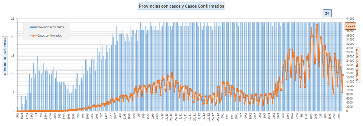 Sigue lenta baja general de confirmados, con leve crecimiento en varias provincias.