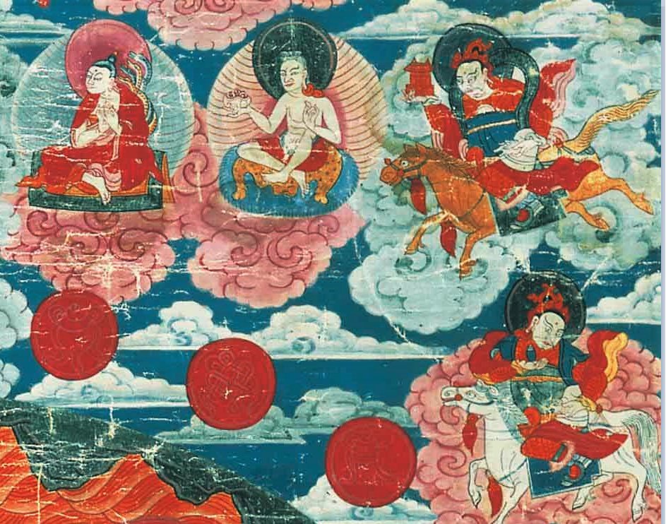 The 2 siddha-s are nAgArjuna (the drAviDa-s call him pAmbATTi: similar iconoraphy) & kR^iShNAcharya with 2 of the 9 vaishravaNa-s.