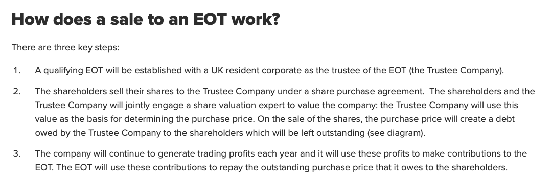 Under an EOT, a founder sells all or some of their shares to a trust, which passes them on to the workers. They pay no tax on the sale. But they don't get the money straight off - the new trust pays for the shares *from the profits in future years*.
