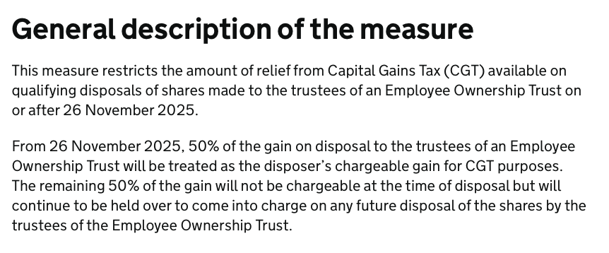 A friend points out a £1bn problem with the Budget measures on employee ownership trusts. It's a bad idea anyway - employee share ownership is good! - but it's made worse by a very basic error in the way they've structured it. (1/?)