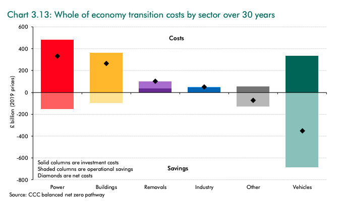 Taken together, the @OBR_UK shows @theCCCuk estimates the costs to the UK of reaching net-zero as £1.4tn, offset by savings of £1.1tn, with an overall net cost of £321bn over 30 years