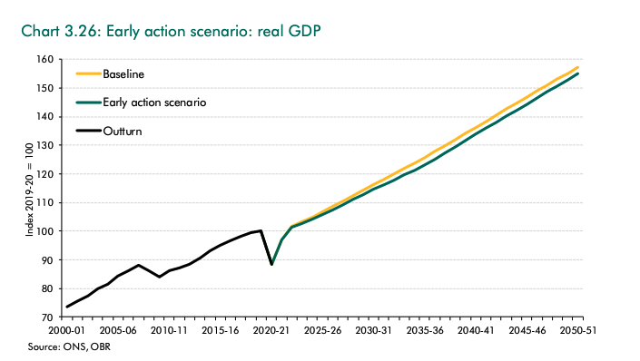 In terms GDP, the @OBR_UK says the UK economy in 2050 would be very slightly smaller if it reaches net-zero emissions, compared to if it doesn't (and ignoring the impacts of warming)