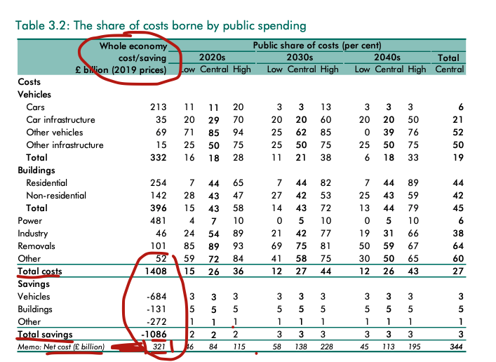 It's clear the large majority of costs are the power sector (electricity) and buildings (heat, insulation), whereas most savings are from transport (EVs)