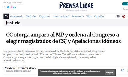 En #Guatemala, la Corte de Constitucionalidad resolvió un amparo iniciado por la Fiscalía, y en el fallo le ordenó al Congreso que no elija para las altas cortes (Suprema o de Apelaciones) a personas involucradas en investigaciones de corrupción: bit.ly/3hlaTeJ