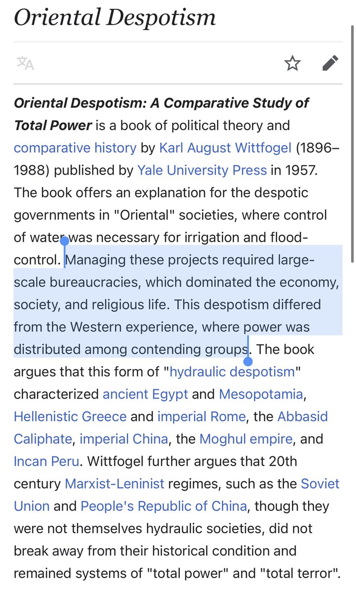Apparently there is a book on this subject, written by a Frankfurt School author, which describes “Oriental Despotism” as a top-down totalitarian system of bureaucratic control that contrasts with the Western system of decentralized power & competing interest groups.