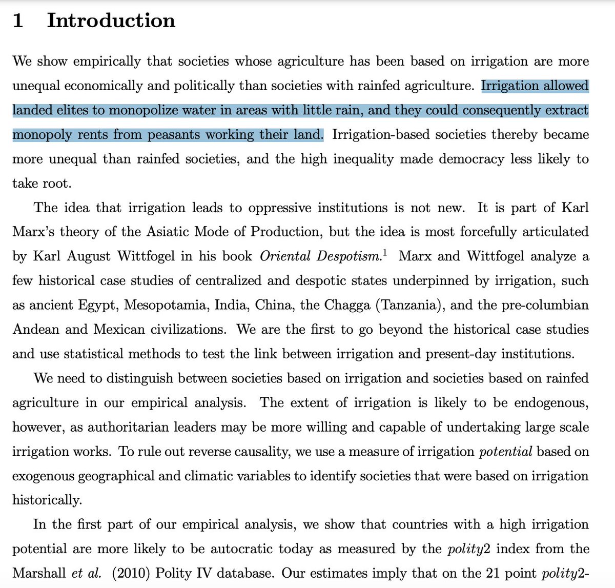 Societies that rely on central irrigation projects (not rainfall) are prone to becoming dependent on a despotic rent-seeking elite that controls the flow of water.