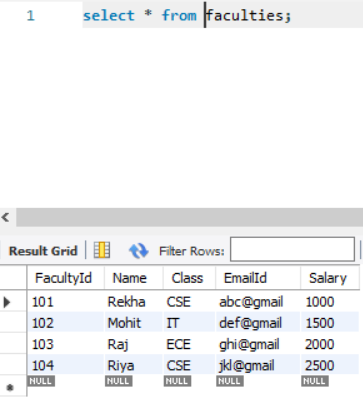 We have columns as FacultyId, Name, Class, EmailId and Salary.