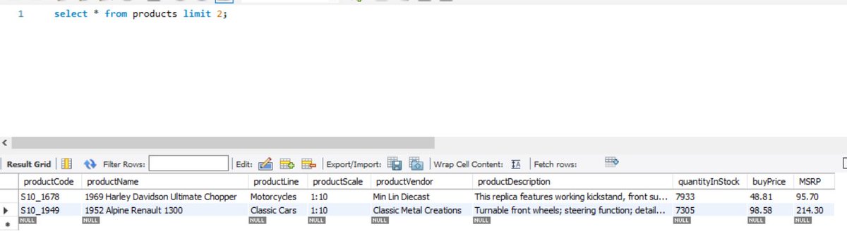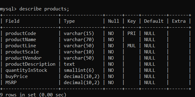 The name of the table is "products". So the columns that we have are productCode, productName, productDescription, among others.