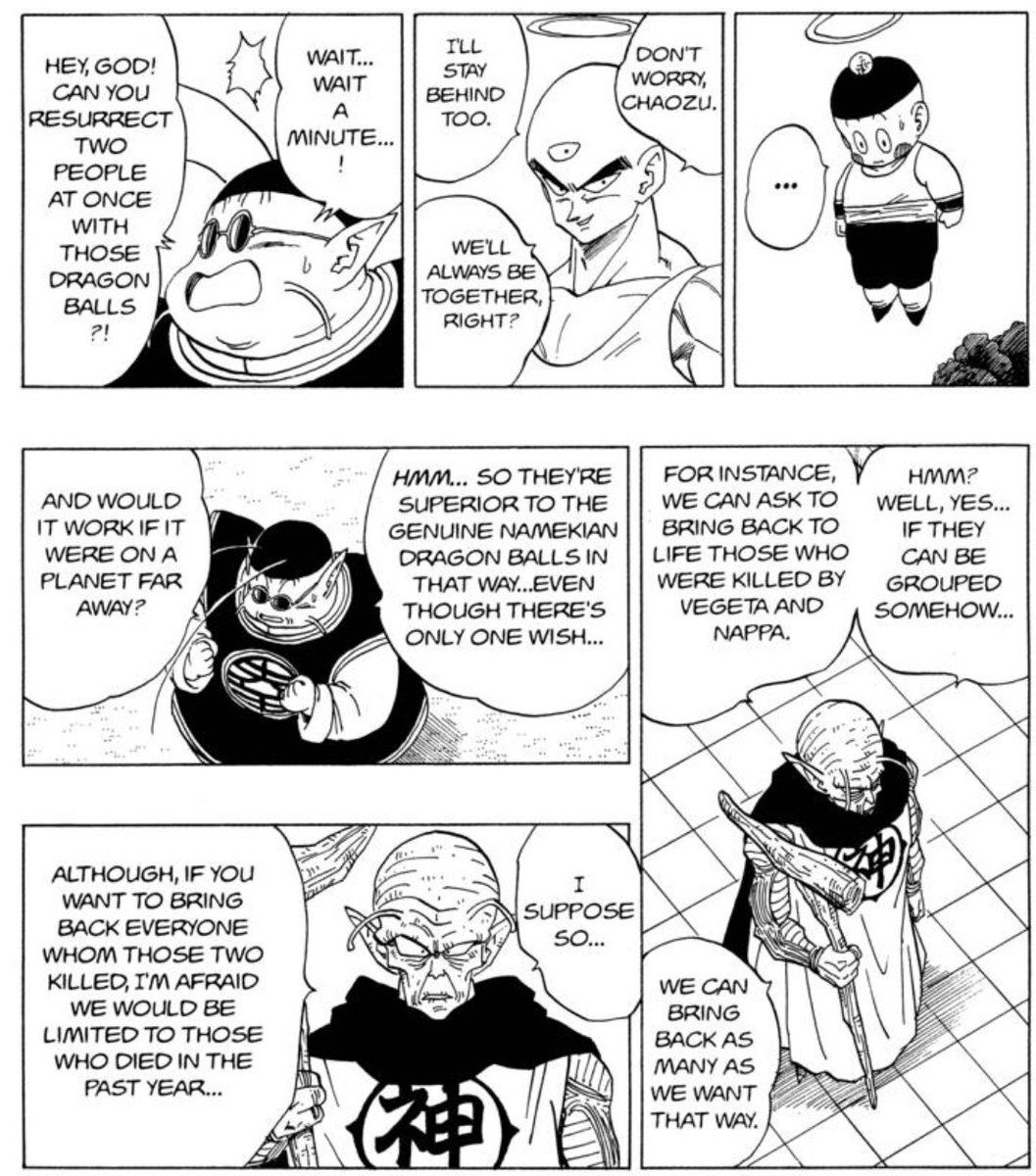 This is made extra clear by the nonchalant way Kaio tells Yamcha and co their resurrection will have to be postponed. They’re all A-OK with waiting a year, which of course would be rather foolish if the year limit wasn’t limited to large groups.