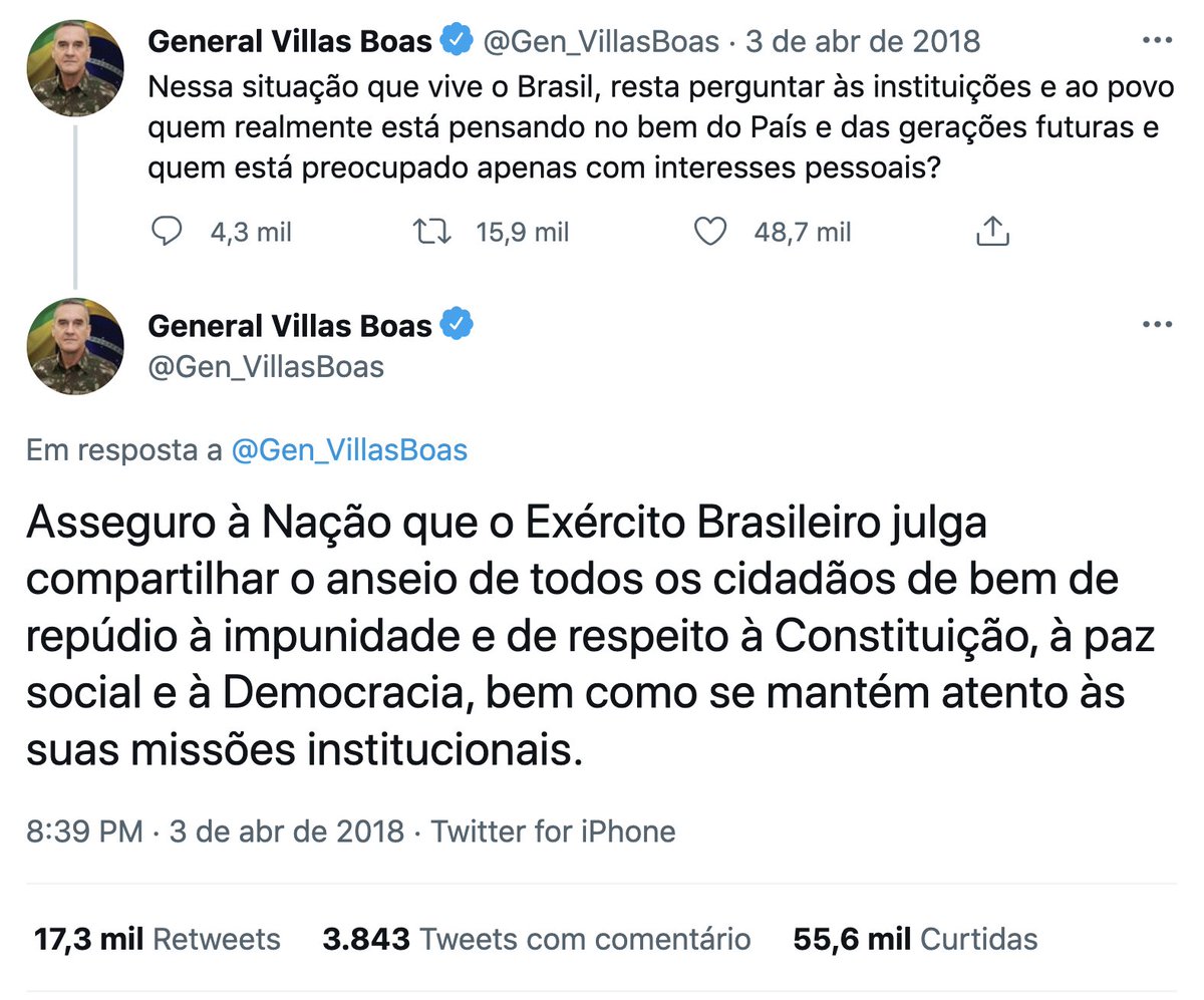 A última nota assinada por um comandante do Exército para questionar atos de um poder da República teve outro teor. Na véspera do julgamento do HC de Lula, em 2018, general Villas Boas questionava "quem está preocupado com interesses pessoais?" e falava em "repúdio à impunidade"
