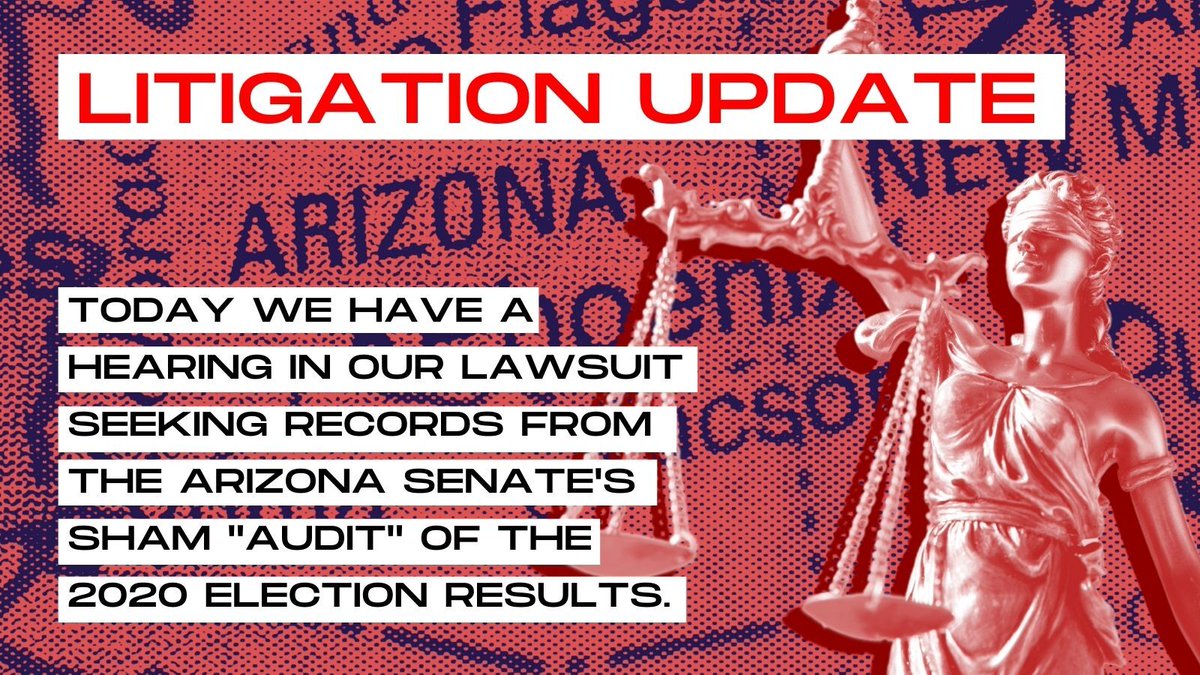 Litigation Update: Today we have a hearing in our lawsuit seeking records from the Arizona Senate's sham "audit" of the 2020 election results. With copycat efforts spreading across the country, it's essential to get the full story about what's going on in Arizona.