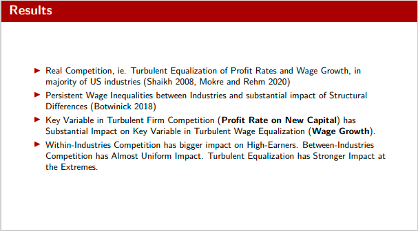 I find (1) wage growth follows turbulent patterns, like profit rates (2) competition within industries stronger affects higher wages (3) competition between industries has a stronger impact at median wages (4) turbulent profit rate equalization is most effective at the extremes.