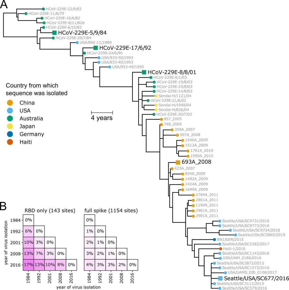 We know other human coronavirus evolve to evade immunity. E.g. a nice study of HCov 229E shows over a period of years new variants arise that escape immunity induced by older variants. 4/ journals.plos.org/plospathogens/…