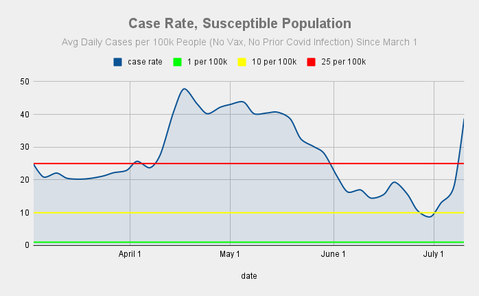 Here's the infection rate, which has risen from 0.76 at the end of May to 0.98 as of a week ago and are likely up to 1.09 now.