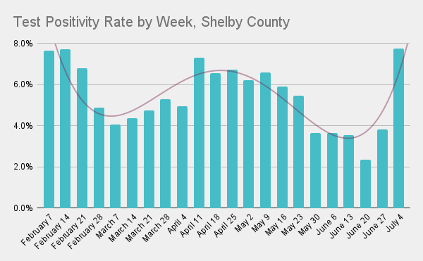 For 5wks, positivity was low. But this week it spiked up to 7.8%, the highest since the wk of Jan31.