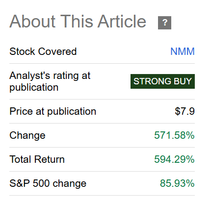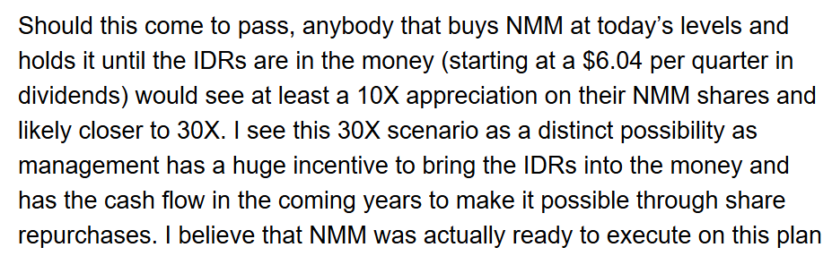 1/ 5 years ago I penned the first of a series of articles on my highest conviction pick $NMM correctly calling for an immediate double✅, and quickly followed it up with a call for an eventual 10x and stretch goal of a 30 bagger.
