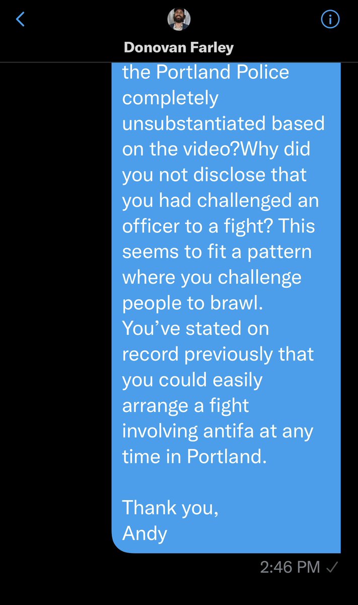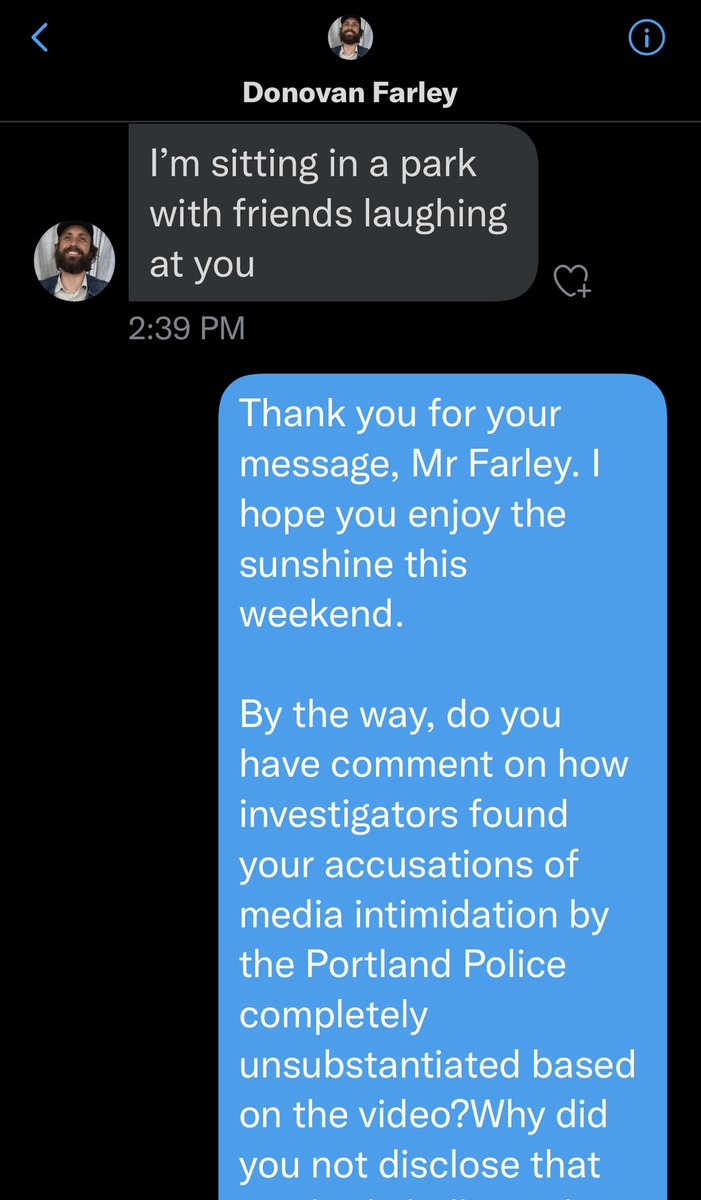 Portland antifa journalist @DonovanFarley, who was discredited in an investigation by the district attorney’s office in Portland, unblocked me and sent me the following direct message.