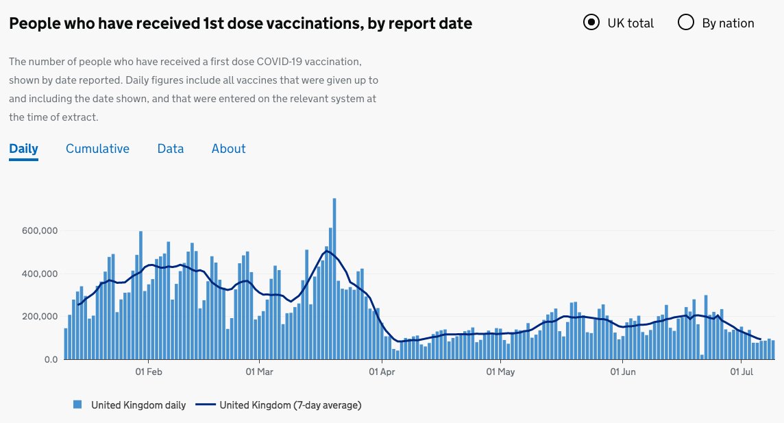 Enfin, de moins en moins de premières doses sont administrées quotidiennement au Royaume-Uni. A noter que les mineurs ne peuvent pas encore s'y faire vacciner.