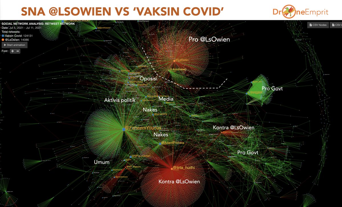 Untuk melihat posisi para pendukung Lois, kita gabungkan peta SNA tentang @LsOwien dengan peta SNA 'Vaksin Covid' yang lebih luas.