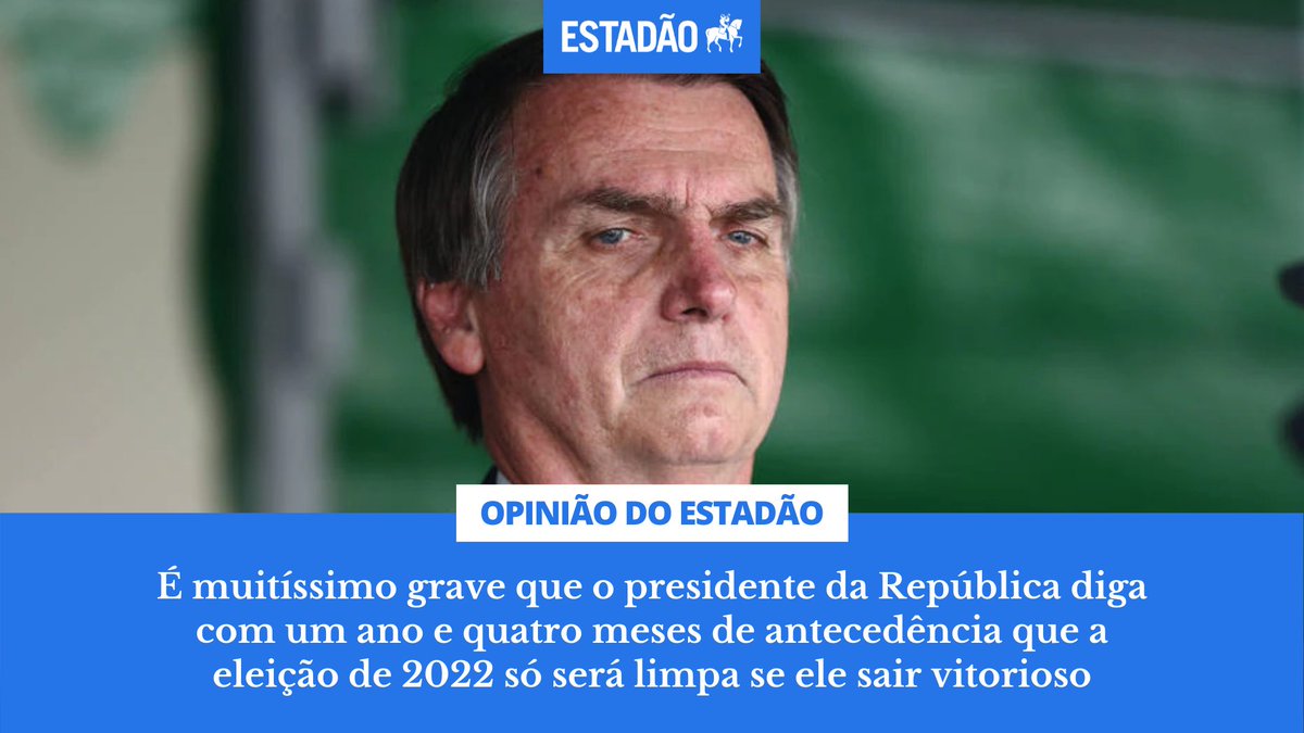 EDITORIAL: É muitíssimo grave que o presidente da República diga com um ano e quatro meses de antecedência que a eleição de 2022 só será limpa se ele sair vitorioso bit.ly/3e6u4XB