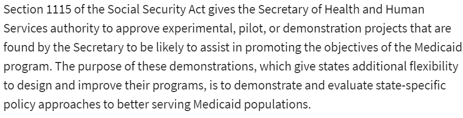 A section 1115 waiver, which gives flexibility of the government to approve experimental, pilot, or demonstration projects